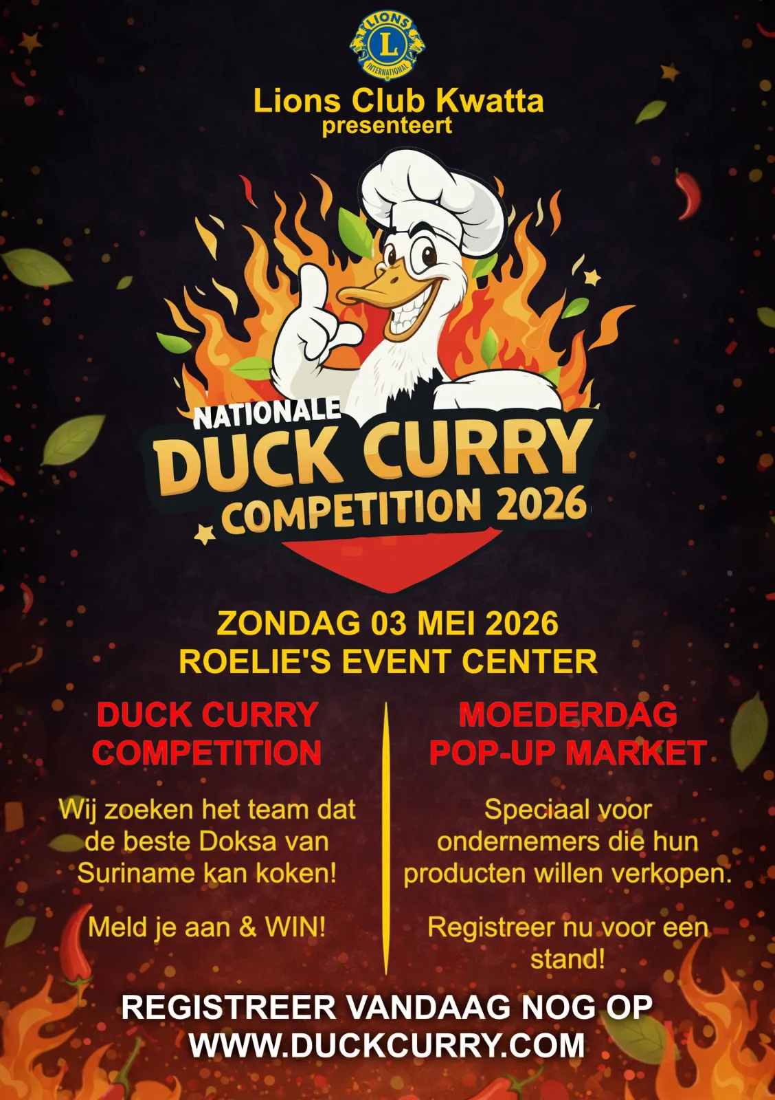 Het evenement waar iederaan al zolang naar uitkijkt komt eraan! De Nationale Duck Curry Competition 2026 samen met een spetterende Moederdag Pop-Up Market op zondag 3 mei 2026 te Roelie’s Event Center. Kook jij de lekkerste DOKSA van Suriname?! Roep je vrienden en familie bijeen en registreer vandaag nog voor de competitie!
