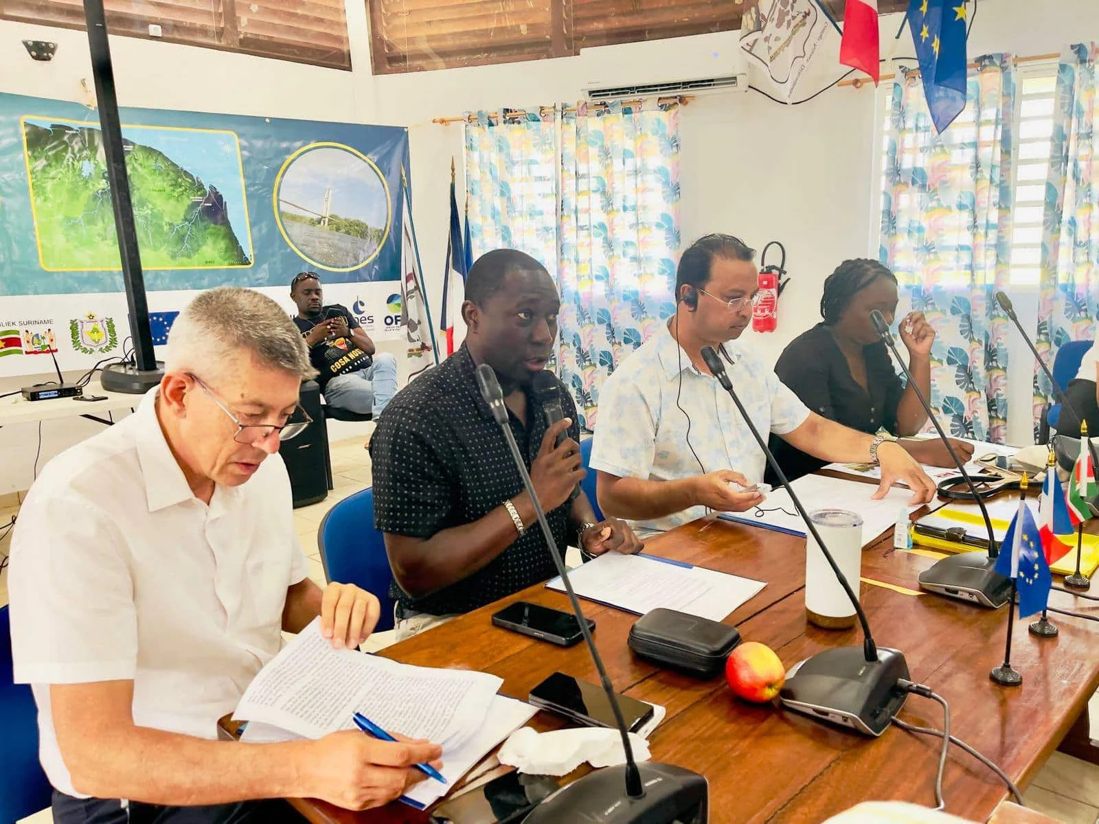 Alle aanwezigen benadrukten de dringende noodzaak van bewustwording met het oog op het illegale goudzoeken, dat troebelheidsproblemen in het water veroorzaakt, het ontstaan van zandbanken in de rivier en de vergiftiging van de biodiversiteit en de lokale bevolking met kwik en cyanide. Verschillende vertegenwoordigers van de traditionele, gouvernementele en technische autoriteiten van de twee landen bespraken vervolgens uitvoerig de uitdagingen in verband met de kwaliteit van het water in de Marowijne-rivier, met bijzondere aandacht voor de sector Grand-Santi.