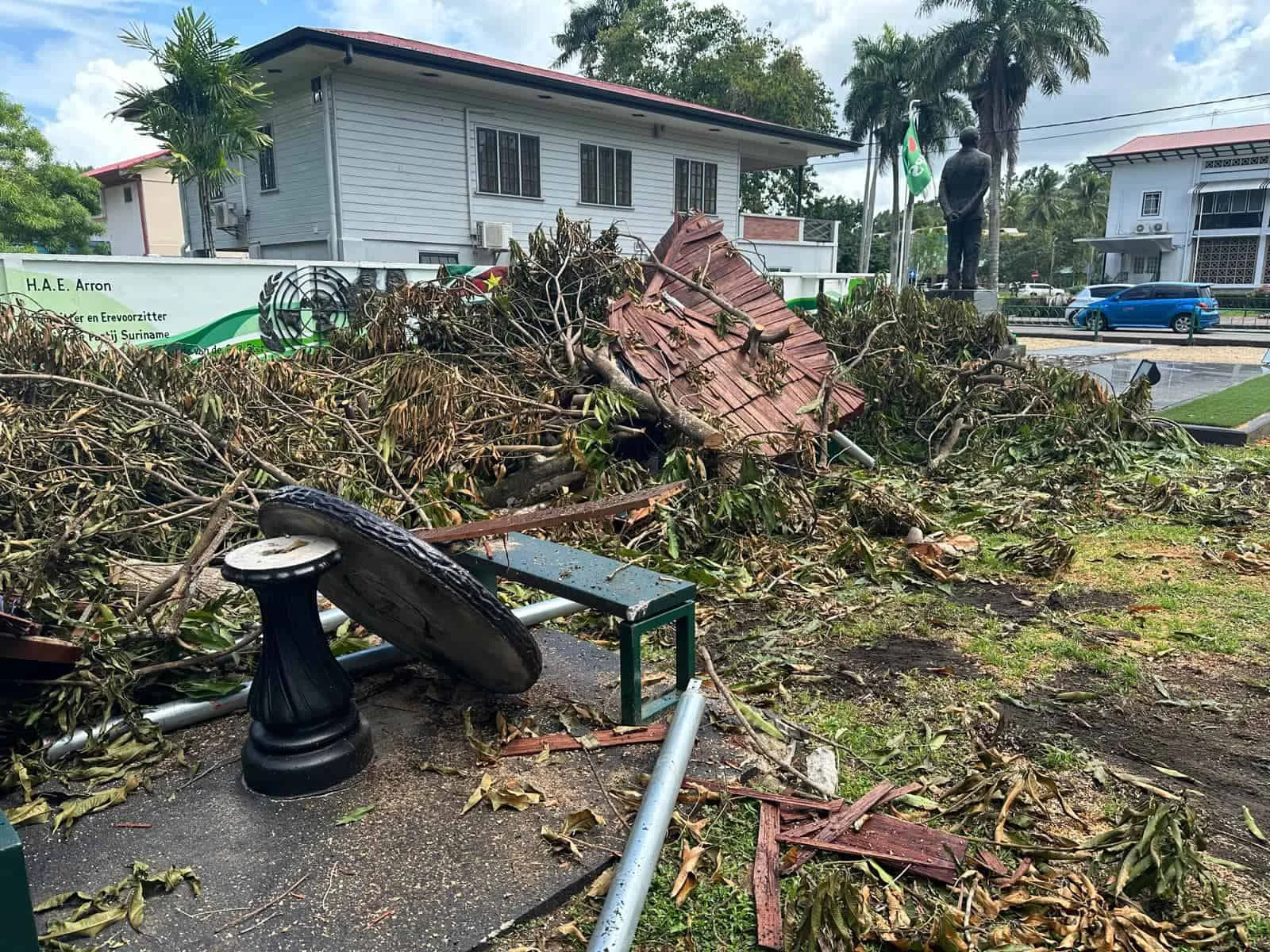 Het team is druk bezig met het verwijderen van takken en resten van de omgevallen boom, met als doel het plein zo snel mogelijk vrij te maken. Dit zal het mogelijk maken om zonder verdere onderbrekingen door te gaan met het herbouwen van de cabanas. We hopen de werkzaamheden snel af te ronden, zodat de gemeenschap weer optimaal van het plein kan genieten.
