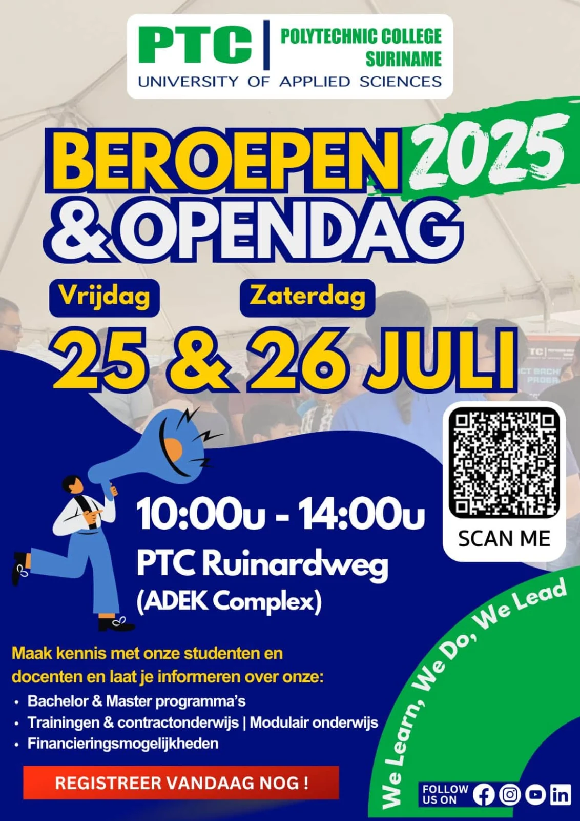 Ben jij nieuwsgierig naar de opleidingen en carrièremogelijkheden die het Polytechnic College Suriname (PTC) te bieden heeft? Wil je meer weten over onze programma’s, inschrijfprocedures of betaalmogelijkheden? Dan is dit hét moment om jouw toekomst een krachtige start te geven.