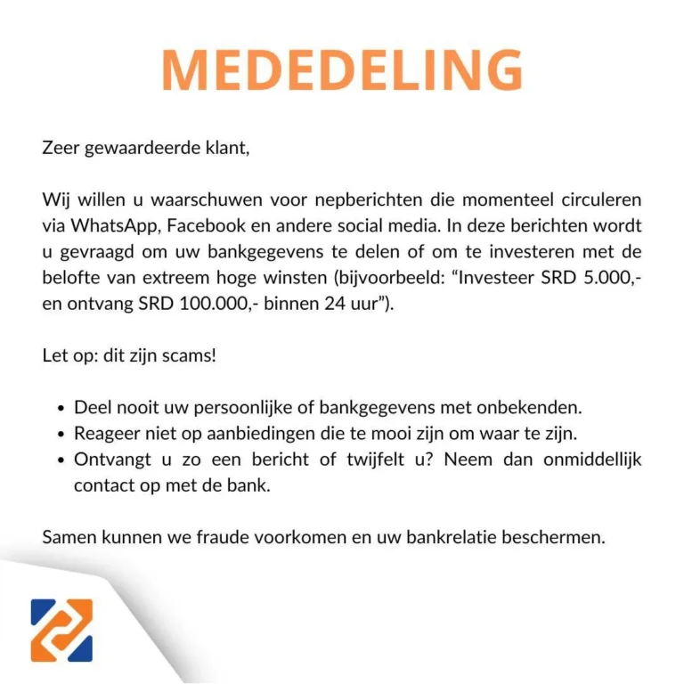 DSB zal nooit vragen om uw gebruikersnaam, wachtwoord, pincode of andere gevoelige informatie via een link te wijzigen. We communiceren alleen via Telesur mobiel: 8837565 en Digicel mobiel: 8230033, 8001, 8002 en 8003. Sla deze nummers op.